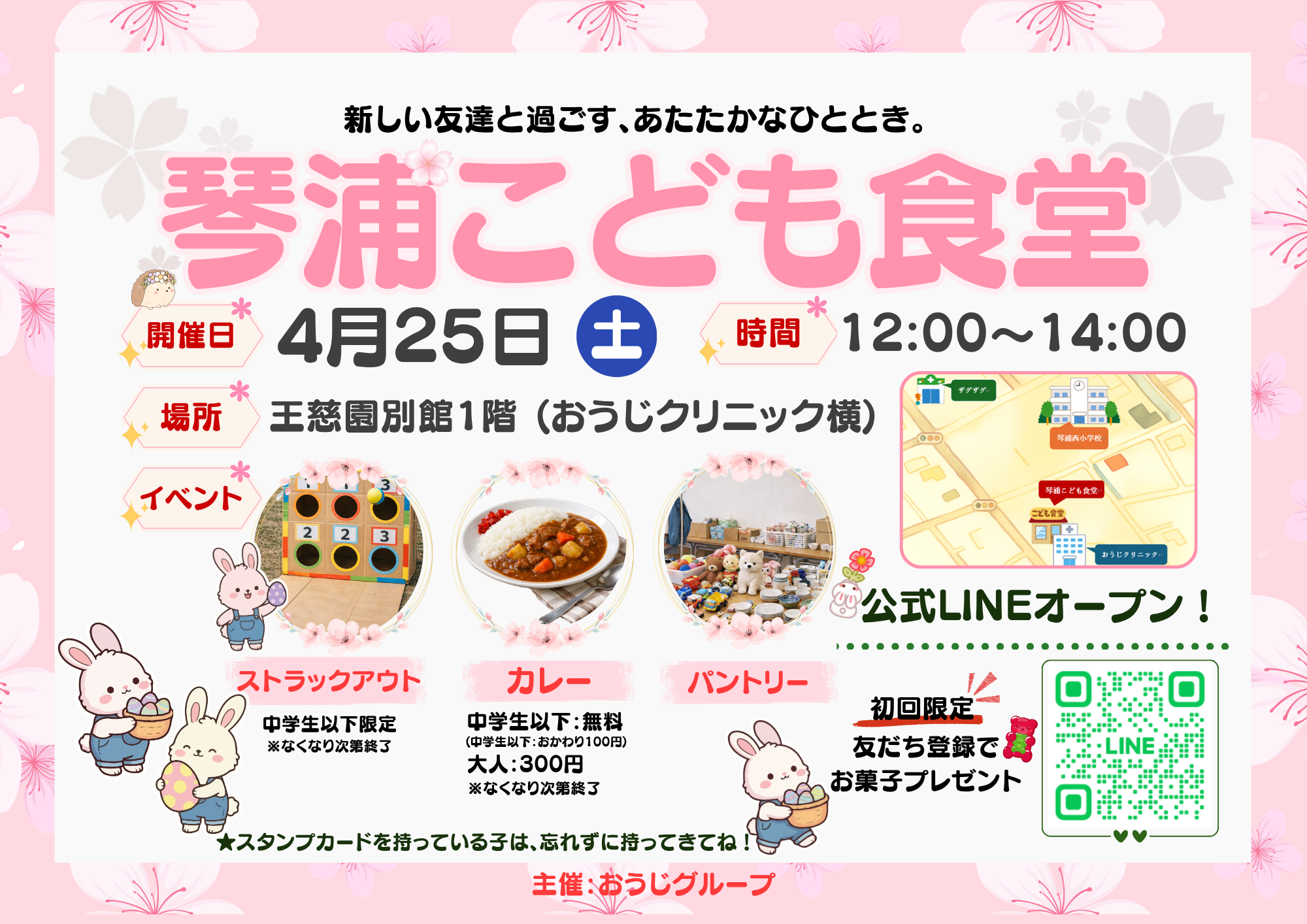 琴浦こども食堂からのお知らせ 2026.04.13 その他のお知らせ 4月25日(土)12時~14時 王慈園別館1階(おうじクリニック横) こども食堂を開催いたします。 中学生まではカレーライス無料🍛 今回はストラックアウトもあるよ🥎 入札結果 前の記事